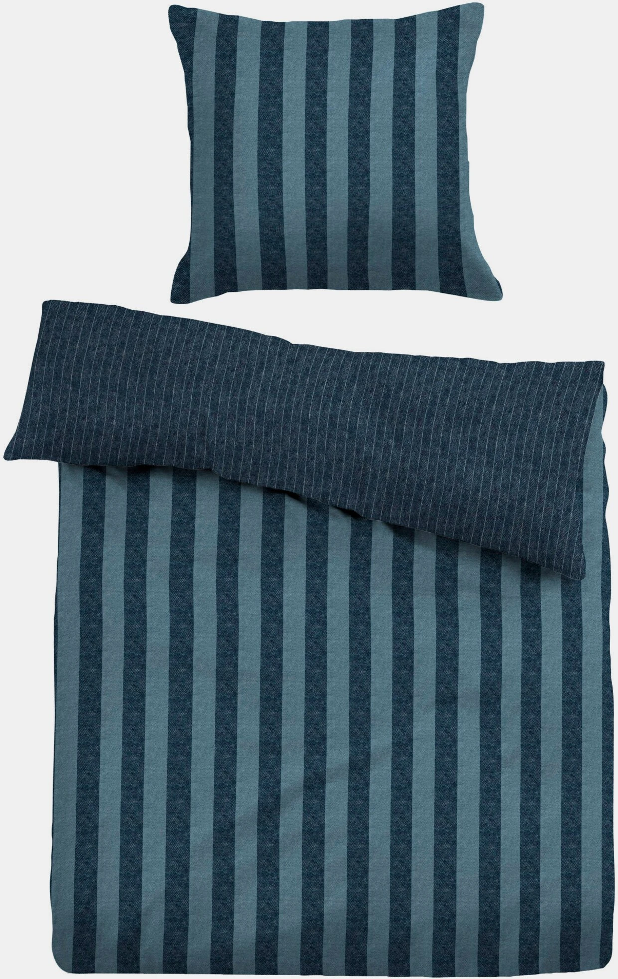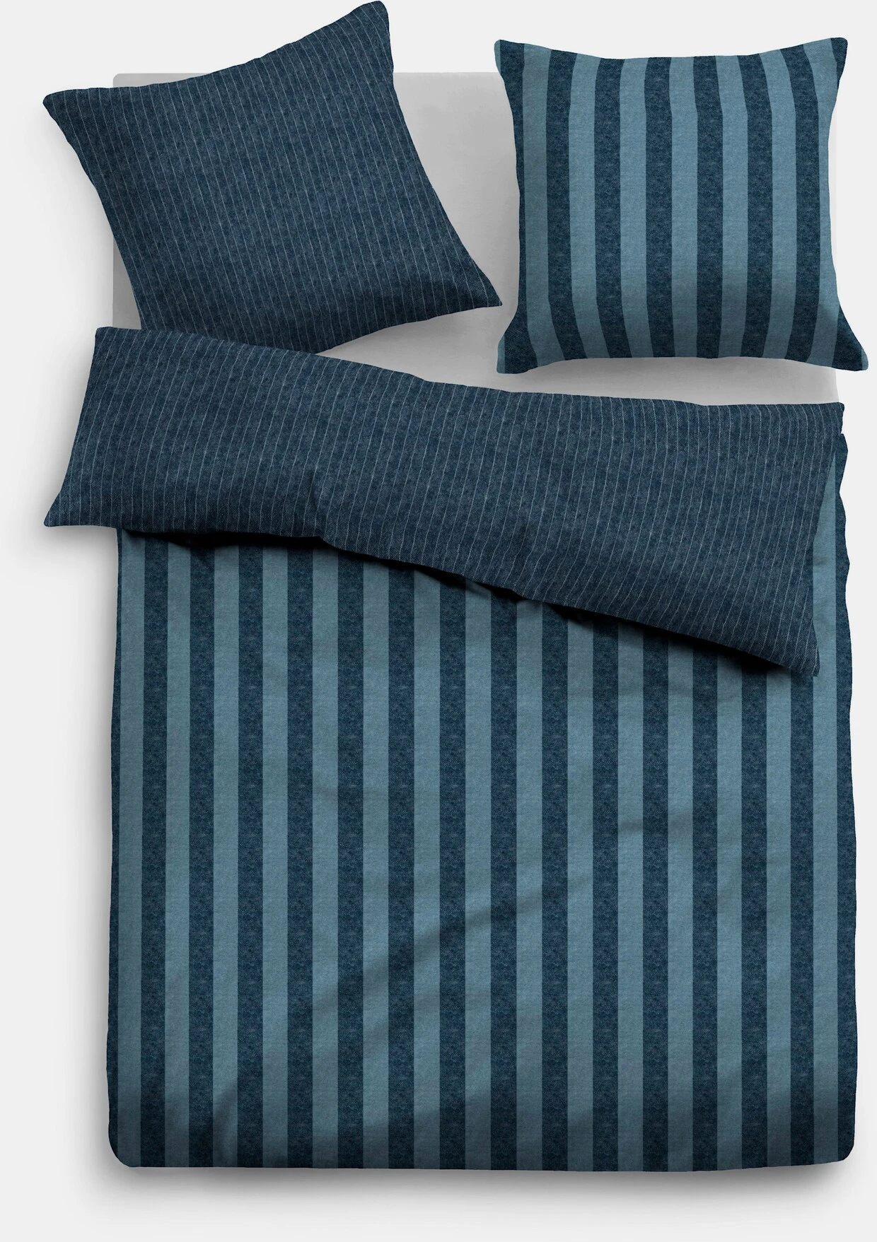 Wende-Bettwäsche von TOM TAILOR. In moderner Melange-Optik mit edlem Streifen-Dessin. Aus kuschelweichem Flanell, hautsympathisch, atmungsaktiv und herrlich wärmend. Pflegeleicht, bügelfrei und einlaufsicher dank hochwertiger Sanfor-Veredlung. Made in Germany. Alle Teile mit Reißverschluss.Artikelnummer: 500.765.005Marke: TOM TAILORFarbe: blau-marineVerschluss: ReißverschlussMaterial: 100% BaumwolleStoffart: FlanellZusatzinformation: Kissen- und BettbezugPflegehinweis: Maschinenwäsche bis 60 °CMaße Kissenbezüge: L 80 x B 80 cmMaße Bettbezug: L 200 x B 135 cm