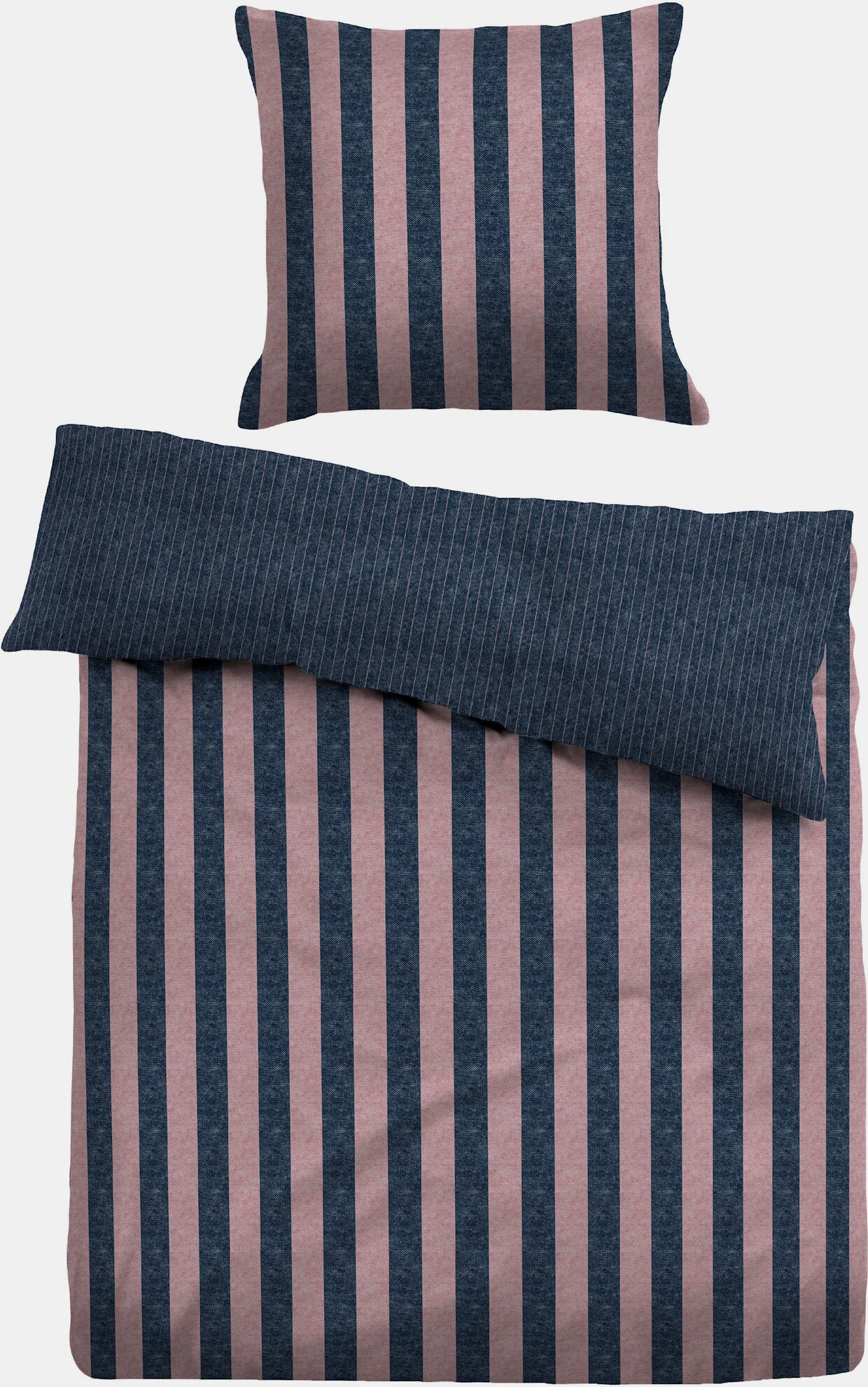 Wende-Bettwäsche von TOM TAILOR. In moderner Melange-Optik mit edlem Streifen-Dessin. Aus kuschelweichem Flanell, hautsympathisch, atmungsaktiv und herrlich wärmend. Pflegeleicht, bügelfrei und einlaufsicher dank hochwertiger Sanfor-Veredlung. Made in Germany. Alle Teile mit Reißverschluss.Artikelnummer: 500.753.005Marke: TOM TAILORFarbe: rosé-blauVerschluss: ReißverschlussMaterial: 100% BaumwolleStoffart: FlanellZusatzinformation: Kissen- und BettbezugPflegehinweis: Maschinenwäsche bis 60 °CMaße Kissenbezüge: L 80 x B 80 cmMaße Bettbezug: L 200 x B 135 cm