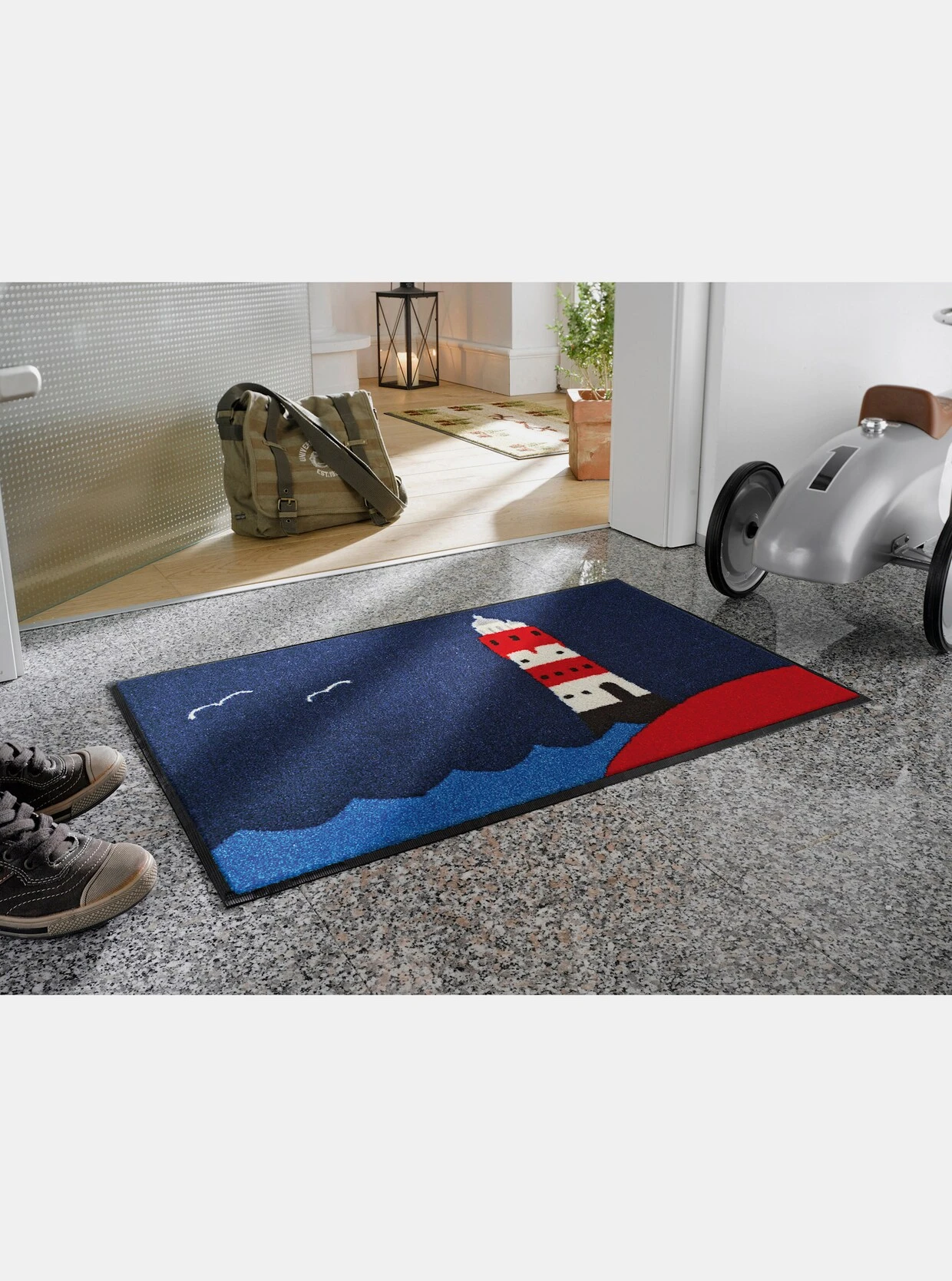 Fußmatte Mit Leuchtturm-Motiv. Äußerst strapazierfähig und pflegeleicht. Für den Innen- und überdachten Außenbereich. Rückseite rutschhemmend gummiert. PVC-frei. Für Fußbodenheizung geeignet, 5 Jahre Qualitätsgarantie.Artikelnummer: 548.783.002Besonderheit: Waschbar, RutschhemmendMarke: wash&dryFarbe: dunkelblau-rotGarantie: 5 JahreMaterial: 100% Polyamid. Rückseite: 100% GummiBeschichtung: rutschhemmende RückseiteFlorhöhe in mm: 7Pflegehinweis: Maschinenwäsche bis 60 °CMaße