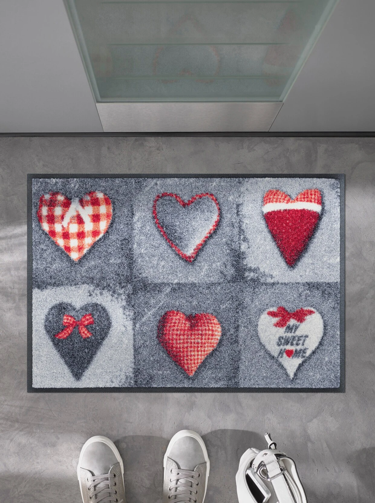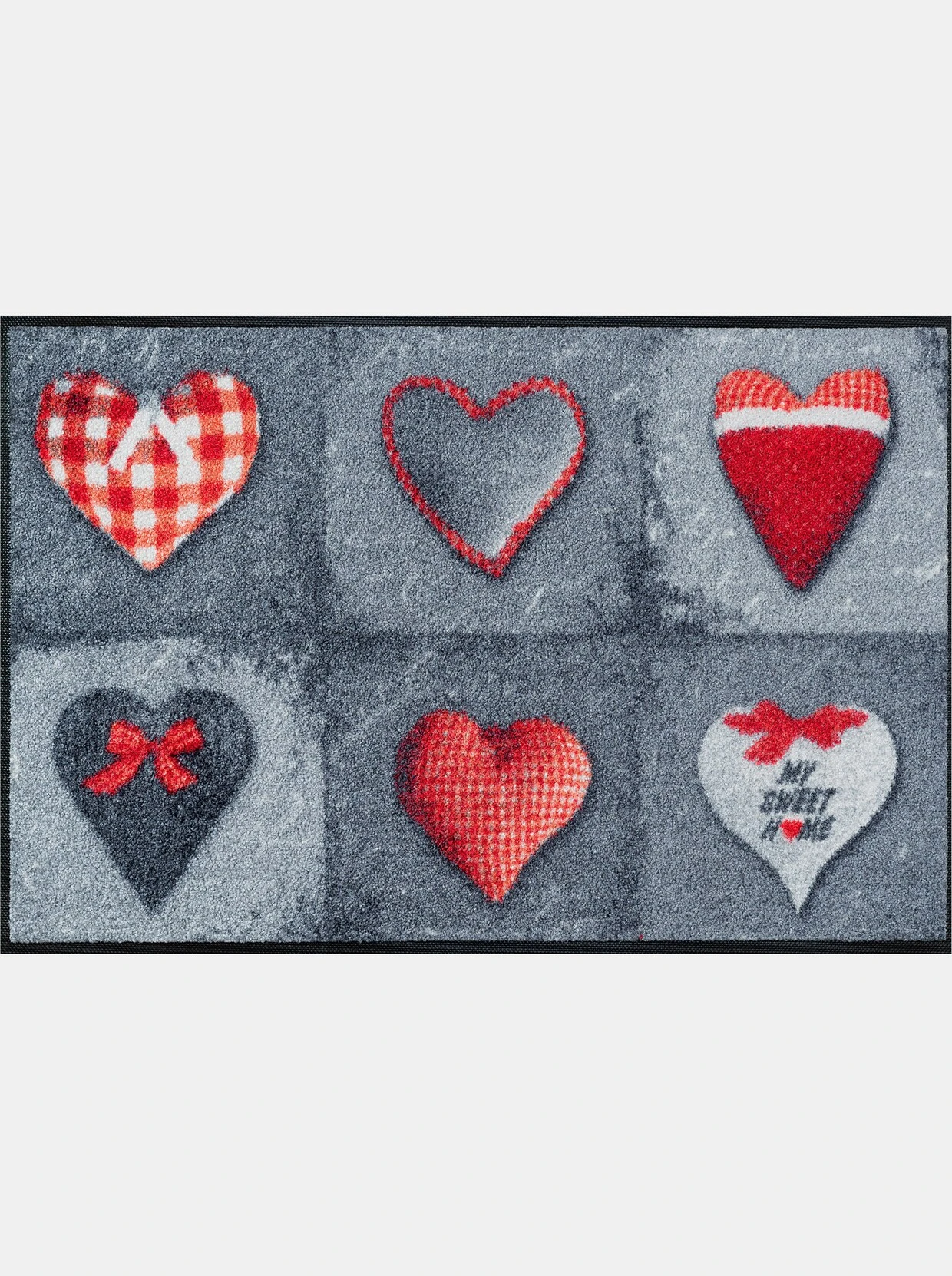 Fußmatte Mit dekorativem Herz-Motiv. Äußerst strapazierfähig und pflegeleicht. Für den Innen- und überdachten Außenbereich. Rückseite rutschhemmend gummiert. PVC-frei. Für Fußbodenheizung geeignet, 5 Jahre Qualitätsgarantie.Artikelnummer: 548.013.002Besonderheit: Waschbar, RutschhemmendMarke: wash&dryFarbe: grau-rotGarantie: 5 JahreMaterial: 100% Polyamid. Rückseite: 100% GummiBeschichtung: rutschhemmende RückseiteFlorhöhe in mm: 7Pflegehinweis: Maschinenwäsche bis 60 °CMaße