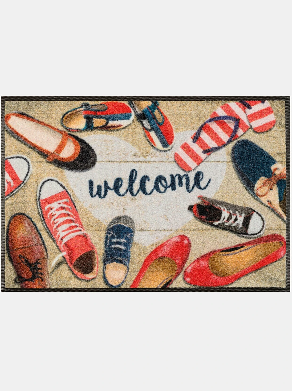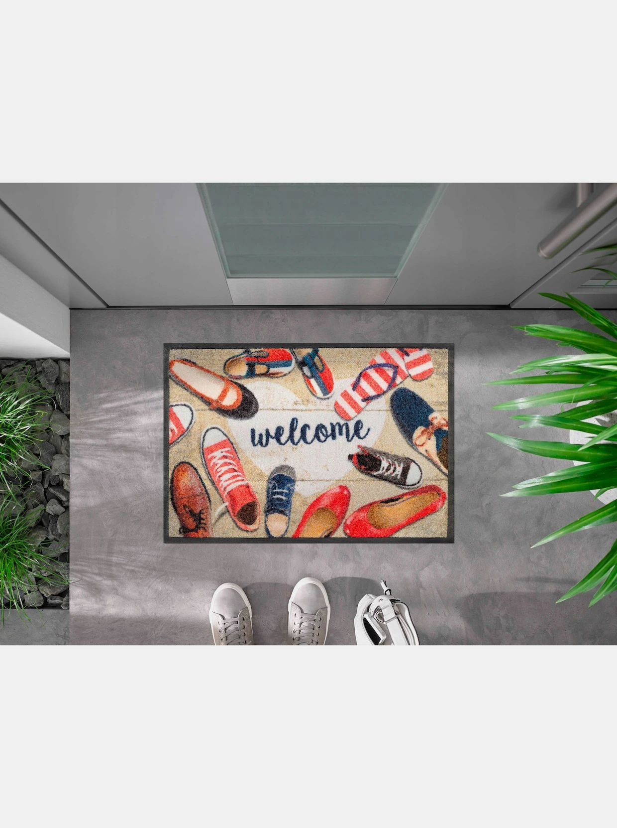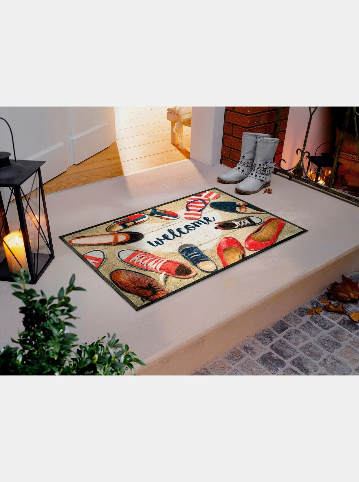 Fußmatte Mit WELCOME-Schriftzug und originellem Schuh-Motiv. Äußerst strapazierfähig und pflegeleicht. Für den Innen- und überdachten Außenbereich. Rückseite rutschhemmend gummiert. PVC-frei. Für Fußbodenheizung geeignet, 5 Jahre Qualitätsgarantie.Artikelnummer: 549.141.002Besonderheit: Waschbar, RutschhemmendMarke: wash&dryFarbe: natur-buntGarantie: 5 JahreMaterial: 100% Polyamid. Rückseite: 100% GummiBeschichtung: rutschhemmende RückseiteFlorhöhe in mm: 7Pflegehinweis: Maschinenwäsche bis 60 °CMaße