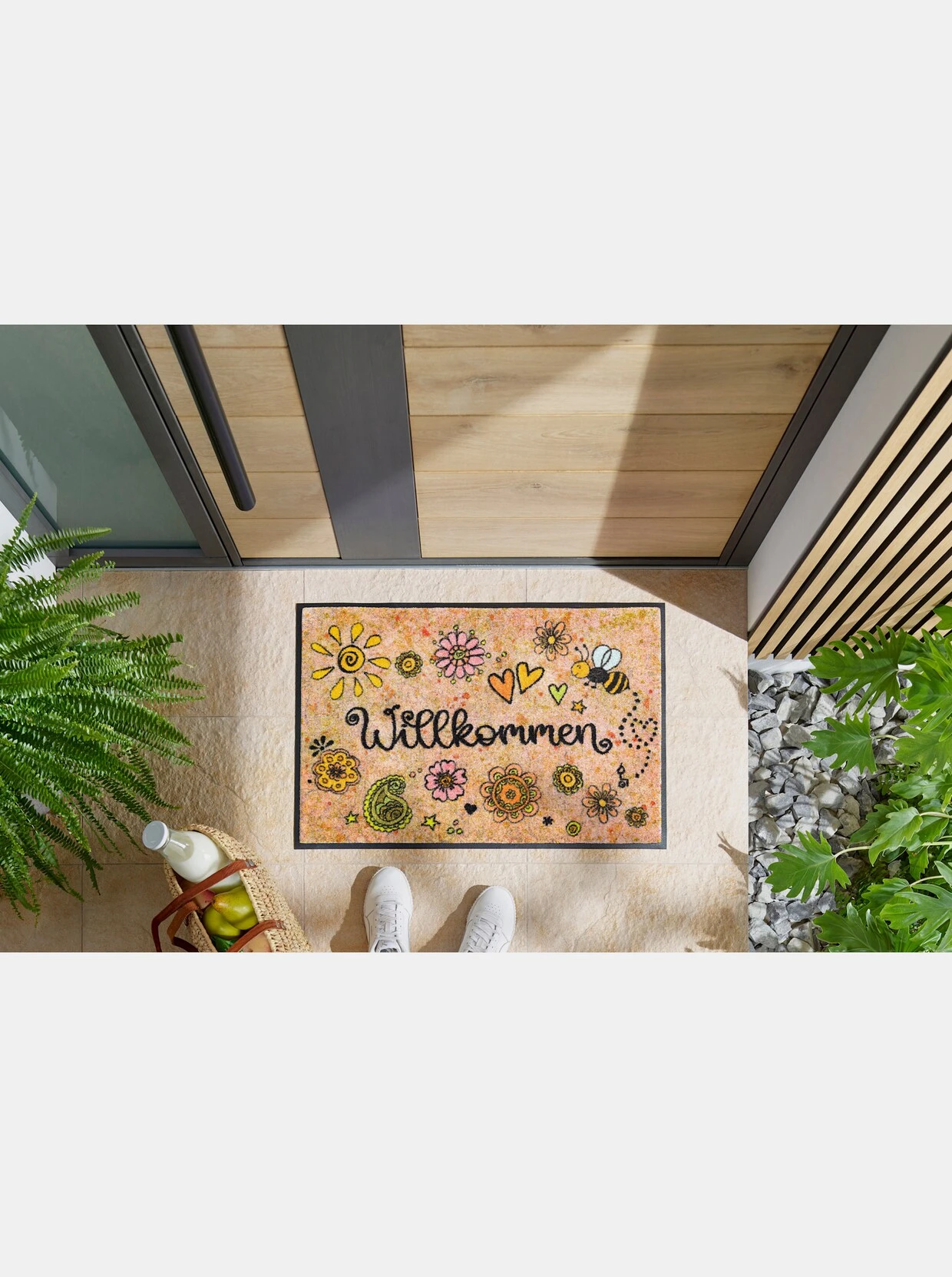 Fußmatte Mit WILLKOMMEN-Schriftzug. Äußerst strapazierfähig und pflegeleicht. Für den Innen- und überdachten Außenbereich. Rückseite rutschhemmend gummiert. PVC-frei. Für Fußbodenheizung geeignet, 5 Jahre Qualitätsgarantie.Artikelnummer: 583.943.002Besonderheit: Waschbar, RutschhemmendMarke: wash&dryFarbe: rosa-bedrucktGarantie: 5 JahreMaterial: 100% Polyamid. Rückseite: 100% GummiFlorhöhe in mm: 7Pflegehinweis: Maschinenwäsche bis 60 °CMaße
